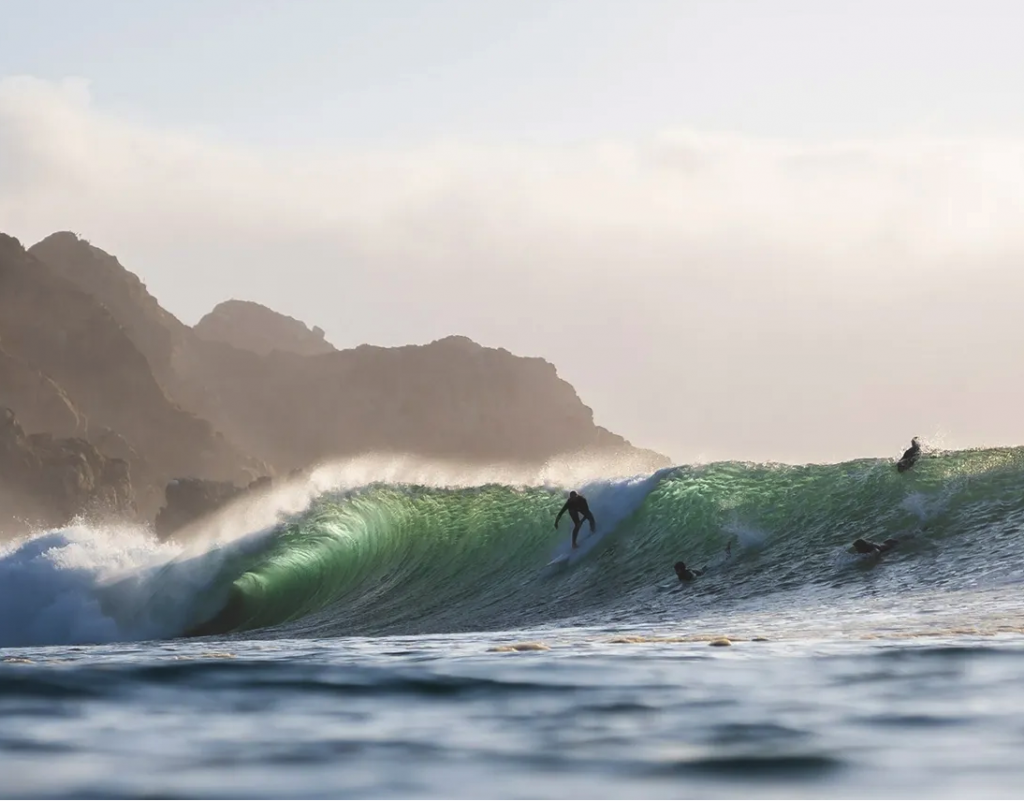 Essa cena poderia ser em Maui ou no sul da Califórnia — exceto por alguns detalhes: as árvores são pinheiros, e não palmeiras; a temperatura da água oscila em torno de 15 graus Celsius; e quase não há ninguém por perto. Vestindo um macacão de neoprene Quiksilver de 4/3 mm — ideal para esse “calor” que mais parece inverno — subo na prancha e começo a remar com um misto de emoção e terror.
